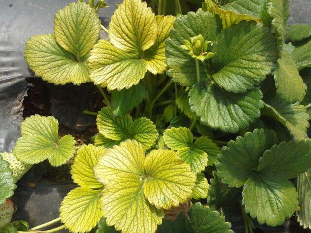 Dấu hiệu dâu tây thối rễ là khi lá chuyển vàng