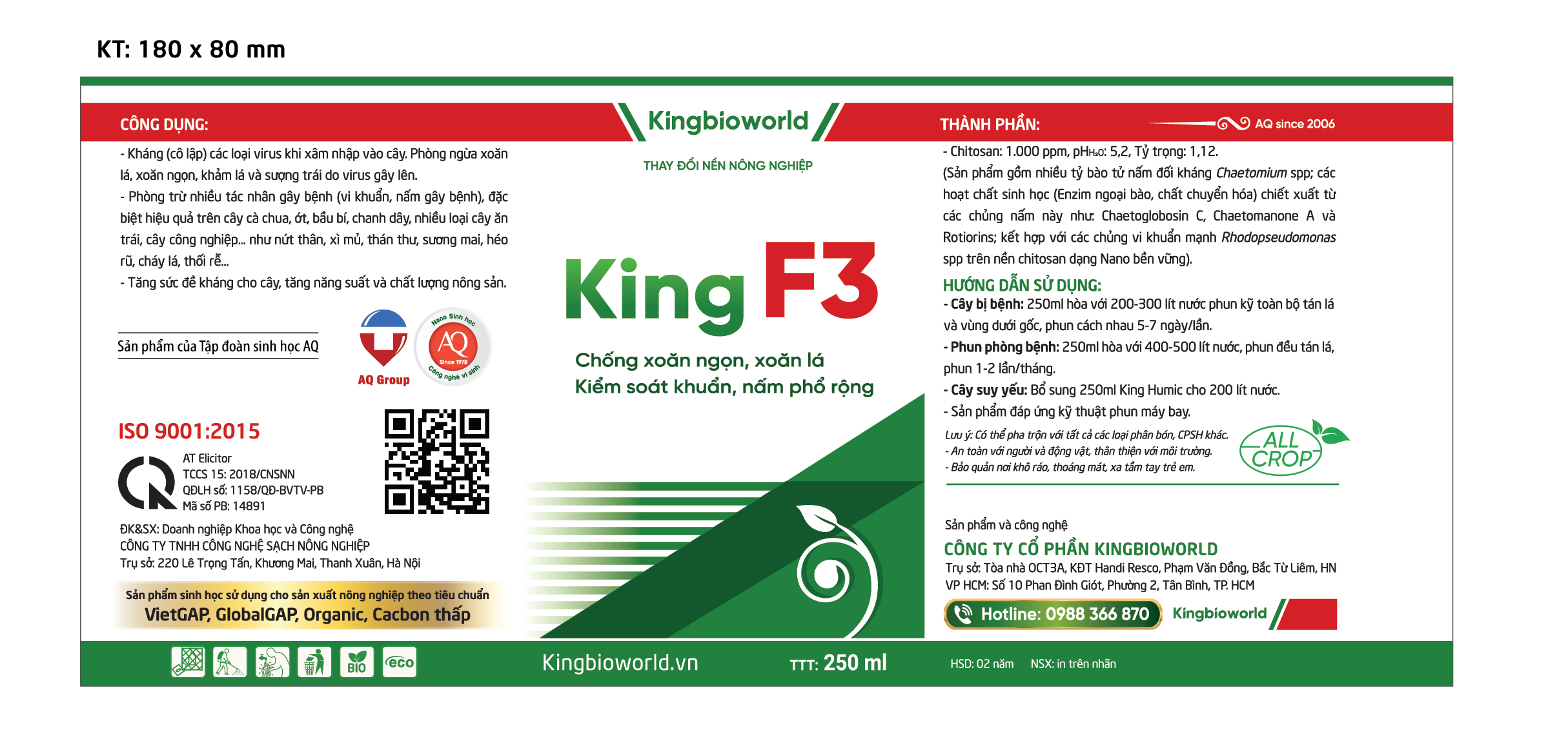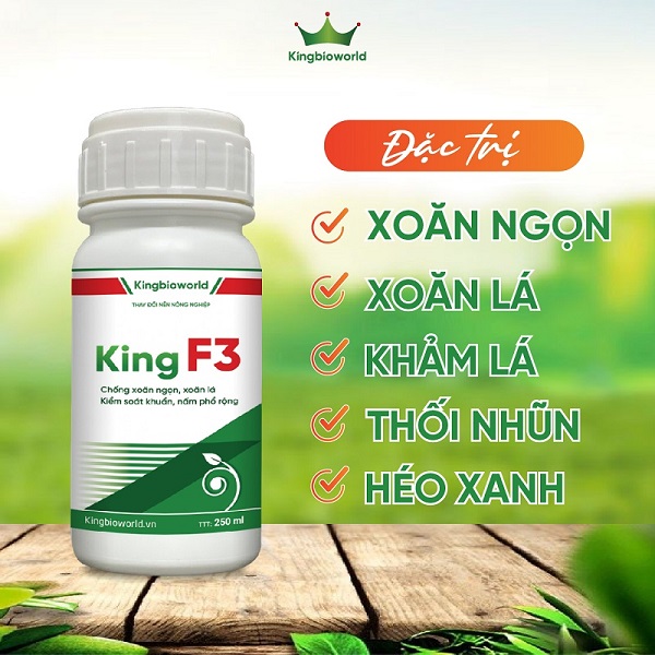 King F3 là sản phẩm chuyên phòng, đặc trị các loại virus, vi khuẩn và nấm phổ rộng - Những tác nhân gây ra bệnh xoăn lá, xoăn ngọn, khảm lá, thối nhũn, héo xanh trên cây trồng. Sản phẩm được sản xuất theo công nghệ vi sinh hiện đại, đảm bảo an toàn cho con người, thiên địch và đất trồng.