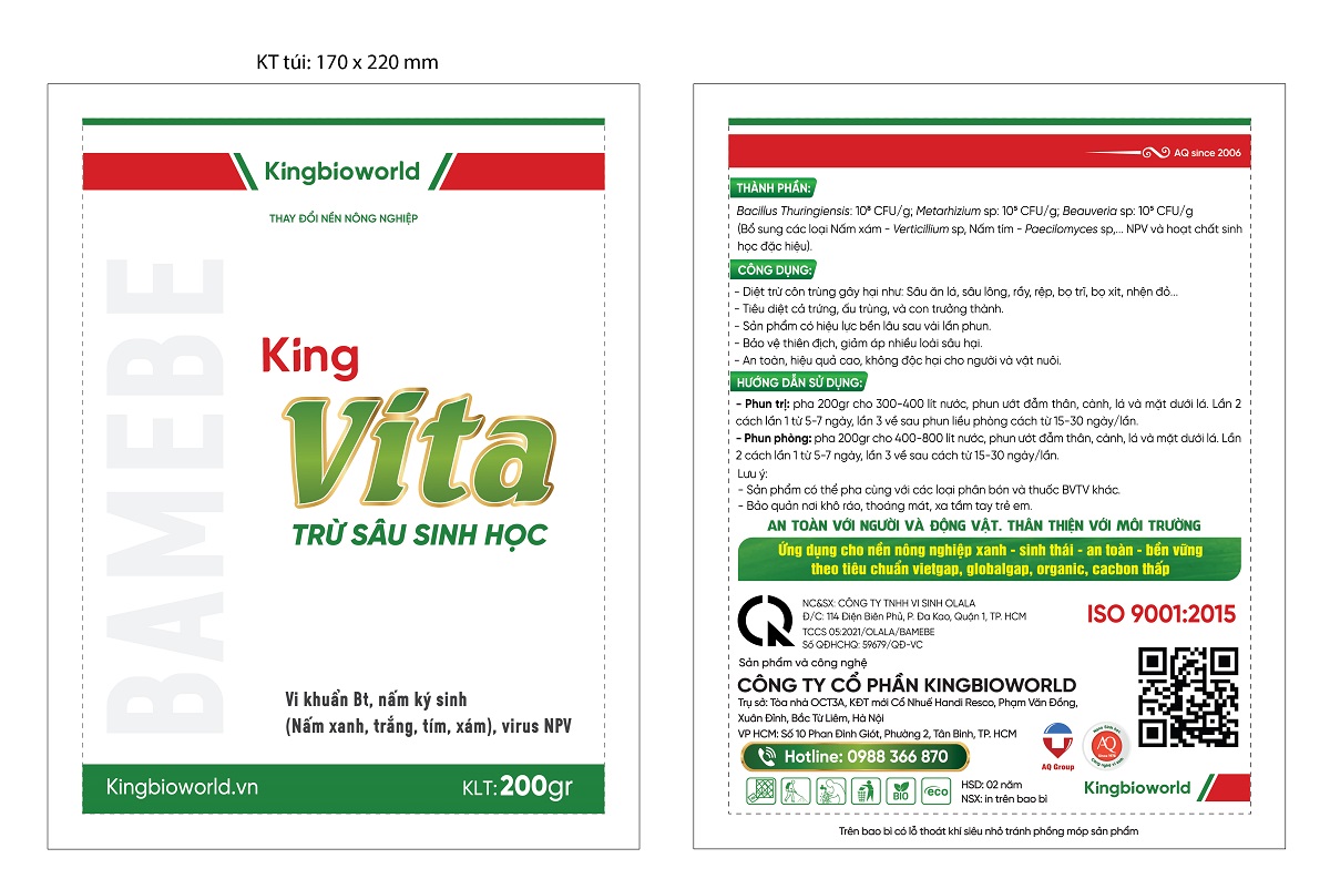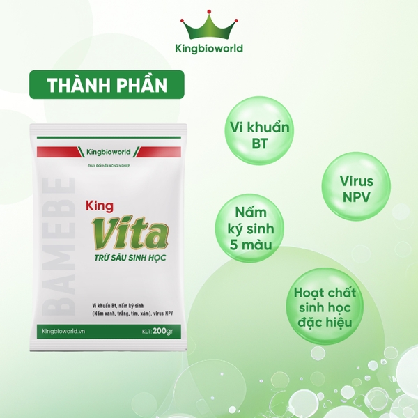 King Vita là sản phẩm diệt côn trùng sinh học, cắt đứt vòng đời của sâu và côn trùng gây hại. Sản phẩm được sản xuất theo công nghệ vi sinh hiện đại, đảm bảo an toàn cho con người, thiên địch và đất trồng.
