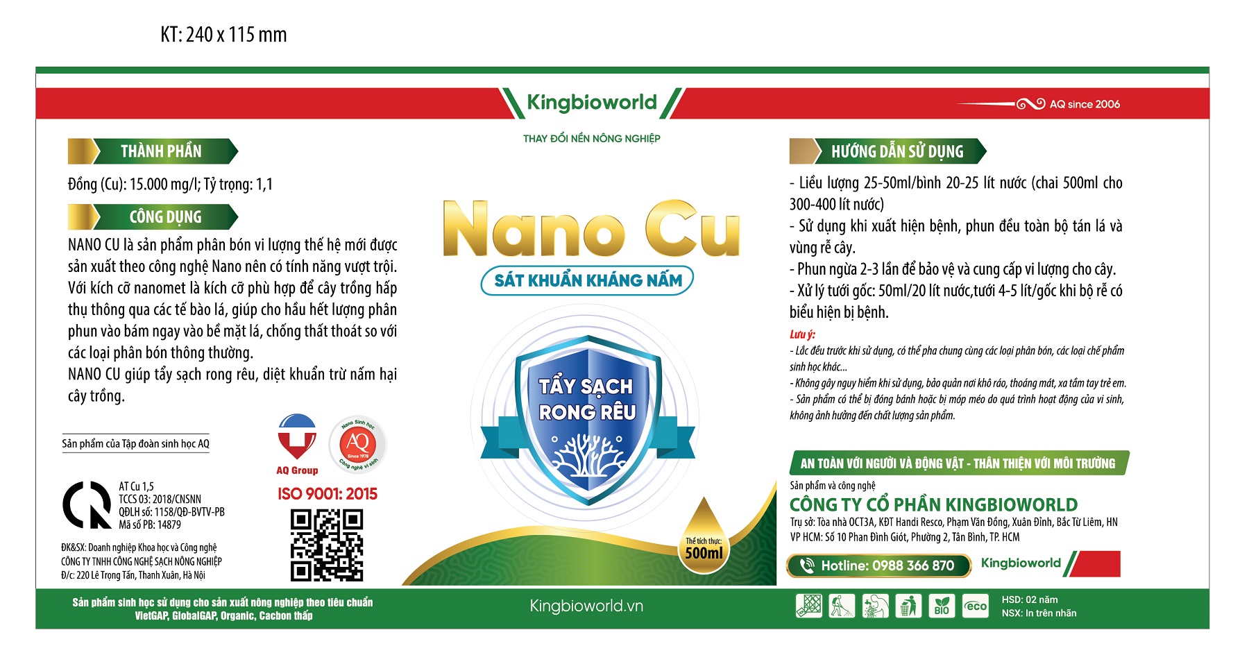 King Nano Cu là sản phầm giúp tẩy sạch rong rêu, nấm mốc, phụ trợ xử lý nấm bệnh, làm lành nhanh vết thương cho cây trồng. Sản phẩm được sản xuất theo công nghệ vi sinh hiện đại, đảm bảo an toàn cho con người, thiên địch và đất trồng.