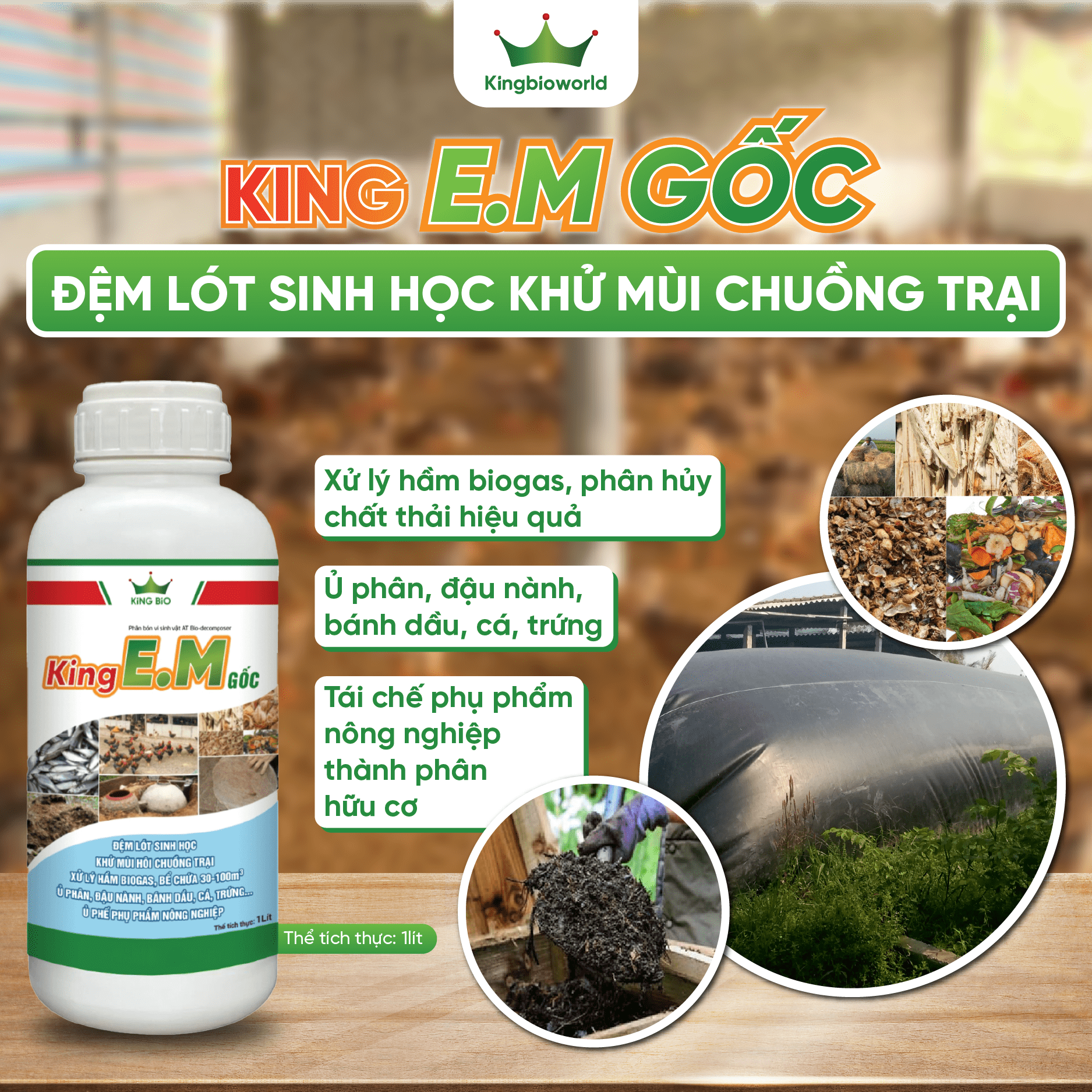 King E.M là sản phẩm đệm lót sinh học, giúp khử mùi hôi chuồng trại, xử lý biogas, ủ phân, ủ cá, ủ ốc,… Sản phẩm được sản xuất theo công nghệ vi sinh hiện đại, đảm bảo an toàn cho con người, thiên địch và đất trồng.