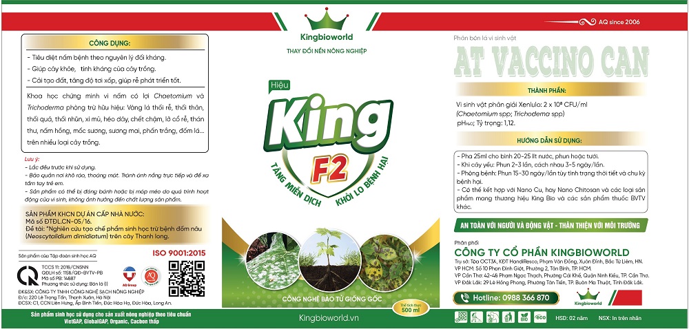 King F2 là sản phẩm chuyên đặc trị bệnh do nấm khuẩn gây ra trên thân, lá, quả như thán thư, thối thân xì mủ, lở cổ rễ, sương mai, đốm lá,… Sản phẩm được sản xuất theo công nghệ vi sinh hiện đại, đảm bảo an toàn cho con người, thiên địch và đất trồng.