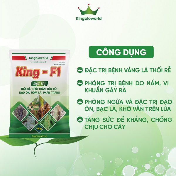 King F1 là sản phẩm chuyên đặc trị đạo ôn, nấm bệnh dưới đất. Sản phẩm được sản xuất theo công nghệ vi sinh hiện đại, đảm bảo an toàn cho con người, thiên địch và đất trồng.