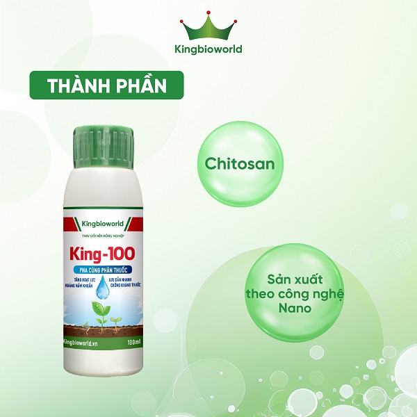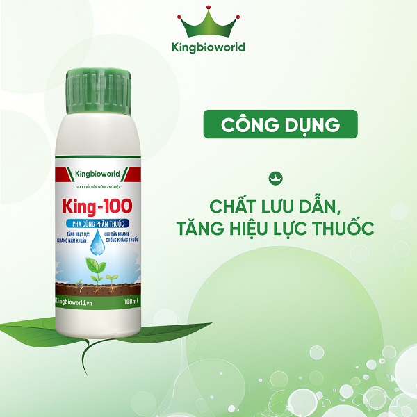 King 100 là chất siêu lưu dẫn, tăng hiệu lực, chống rửa trôi, bốc hơi phân thuốc. Sản phẩm được sản xuất theo công nghệ vi sinh hiện đại, đảm bảo an toàn cho con người, thiên địch và đất trồng.