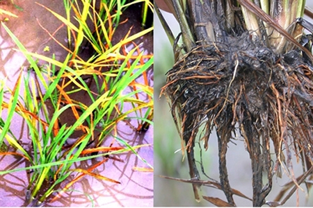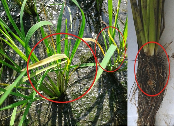 - Giai đoạn đẻ nhánh: Lá lúa vàng nhạt, cây èo uột, rễ bị đen và thối. Lúa chết chòm, đặc biệt ở những vùng đất trũng hoặc ruộng bị ngập úng lâu ngày.